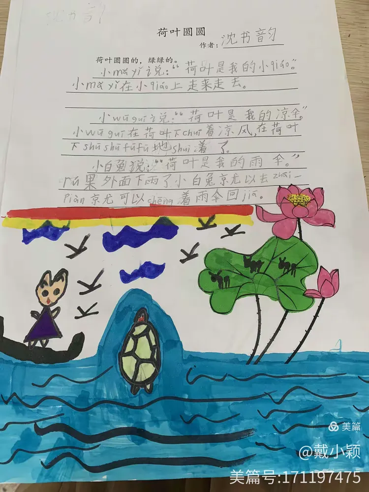 小鸟说“荷叶是仿写荷叶圆圆小鸟说我仿写荷叶圆圆小鸟说的座椅”小鸟在荷叶上看着美丽的风景28 号 范芷琪小白兔说“荷叶是仿写荷叶圆圆小鸟说我的雨伞”小白兔蹦蹦跳跳地拿着。