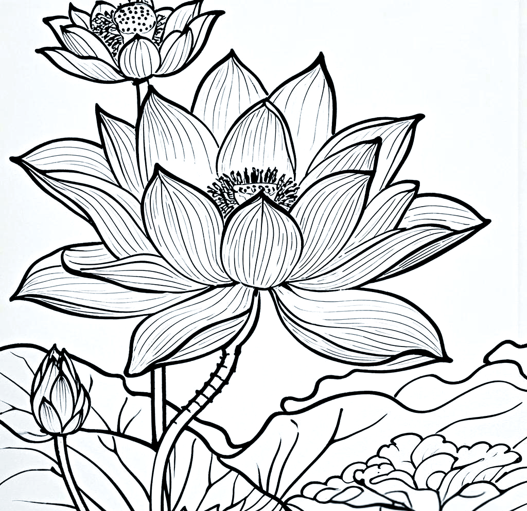 先画出三片像大蒜一样的花瓣再画几片花瓣在花瓣中间画出莲蓬在花瓣的下面画出茎叶在茎叶的下面画出弯弯的池塘简单的上色,一朵亭亭玉立的荷花就画好啦。