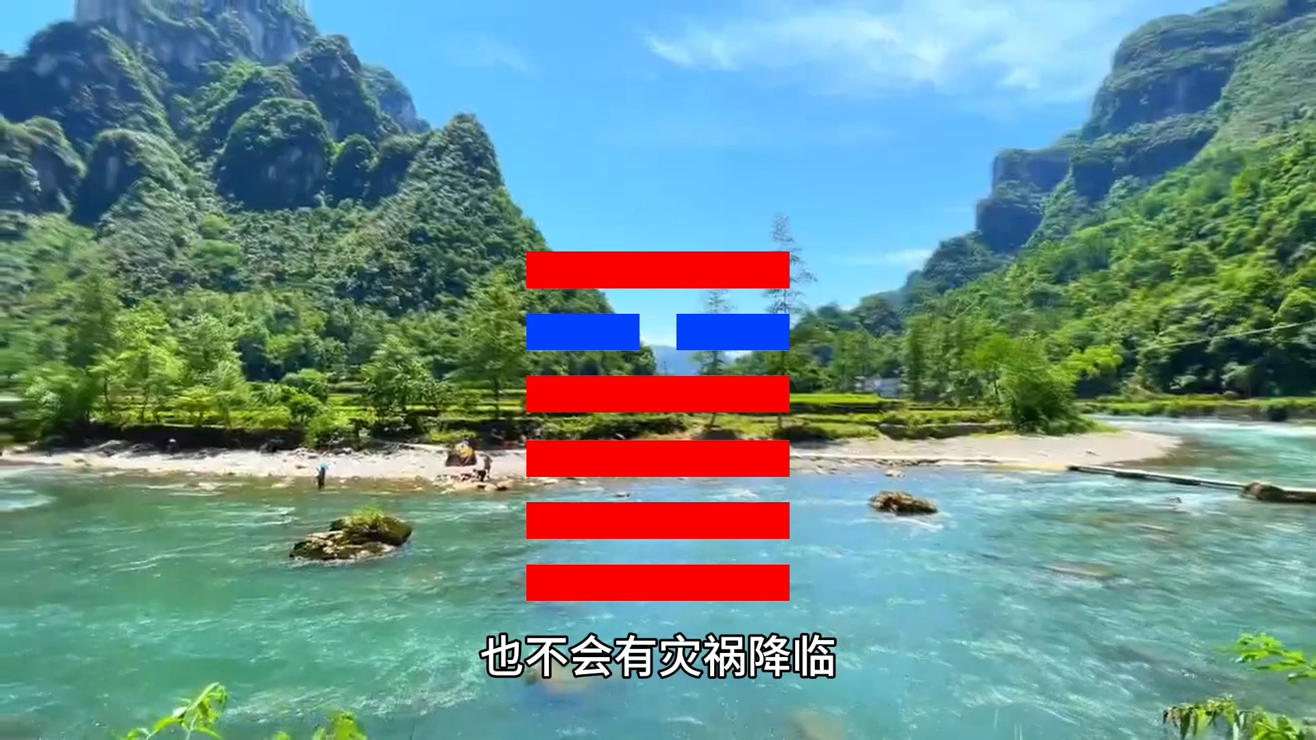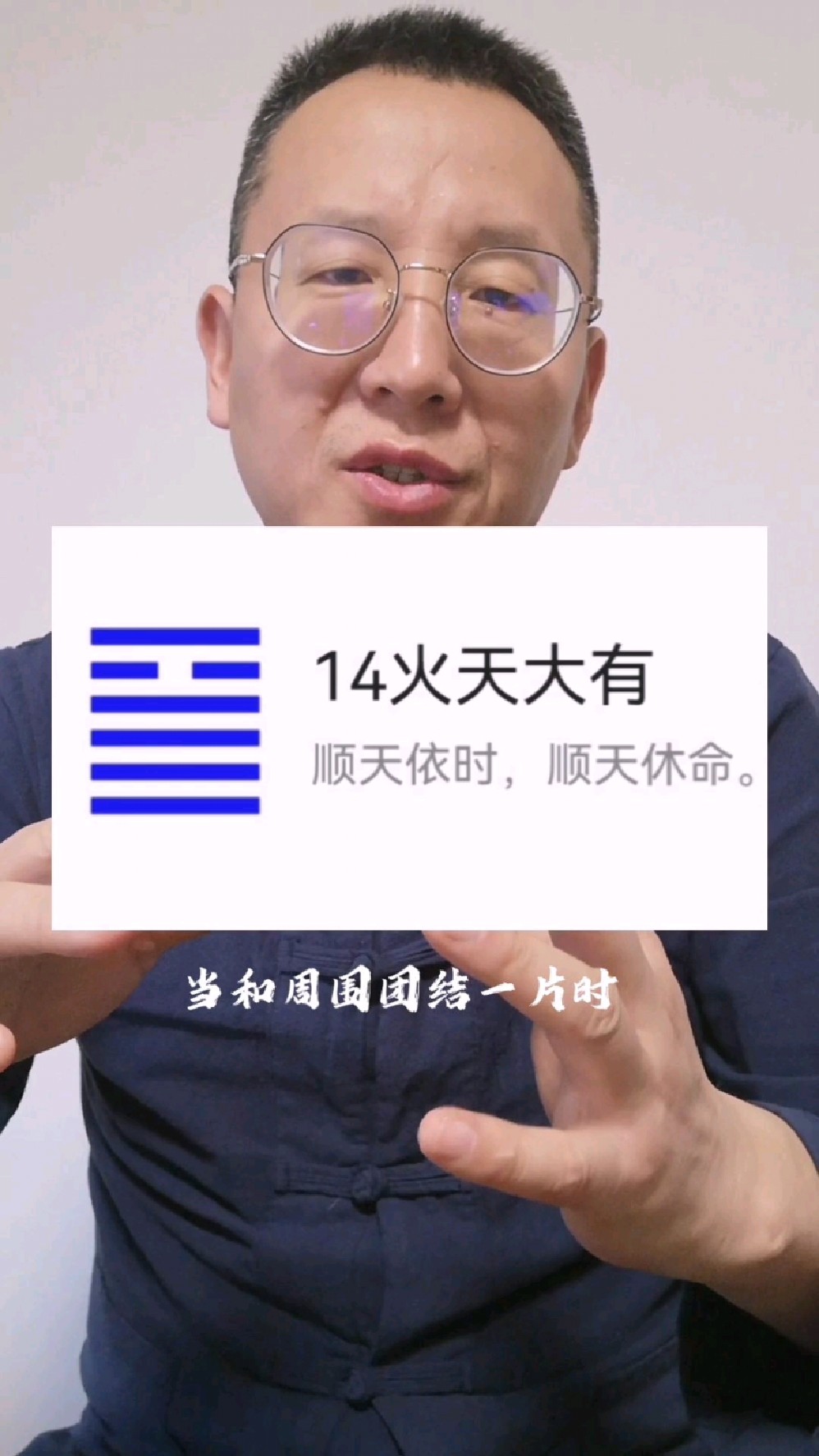 8、蓝教授卜出的卦为“火天大有”卦,上面是代表“火”的“离”卦,下面是代表“天”的“乾”卦,为“天上有火”此卦本为大吉之。