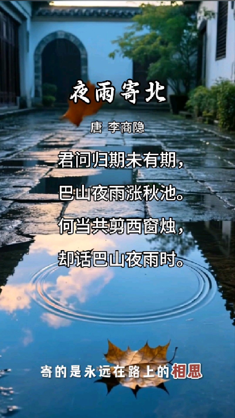 夜雨寄北译文您问归期,归期实难说准,巴山连夜暴雨,涨满秋池何时归去,共剪西窗烛花,当面诉说,巴山夜雨况味夜雨寄北原文君问归期未有期,巴山夜雨涨秋池何当共剪西窗烛,却话巴山夜雨时夜雨寄北是晚唐诗人李商隐身居异乡巴蜀,写给远在长安的妻子或友人的一首抒情七言。