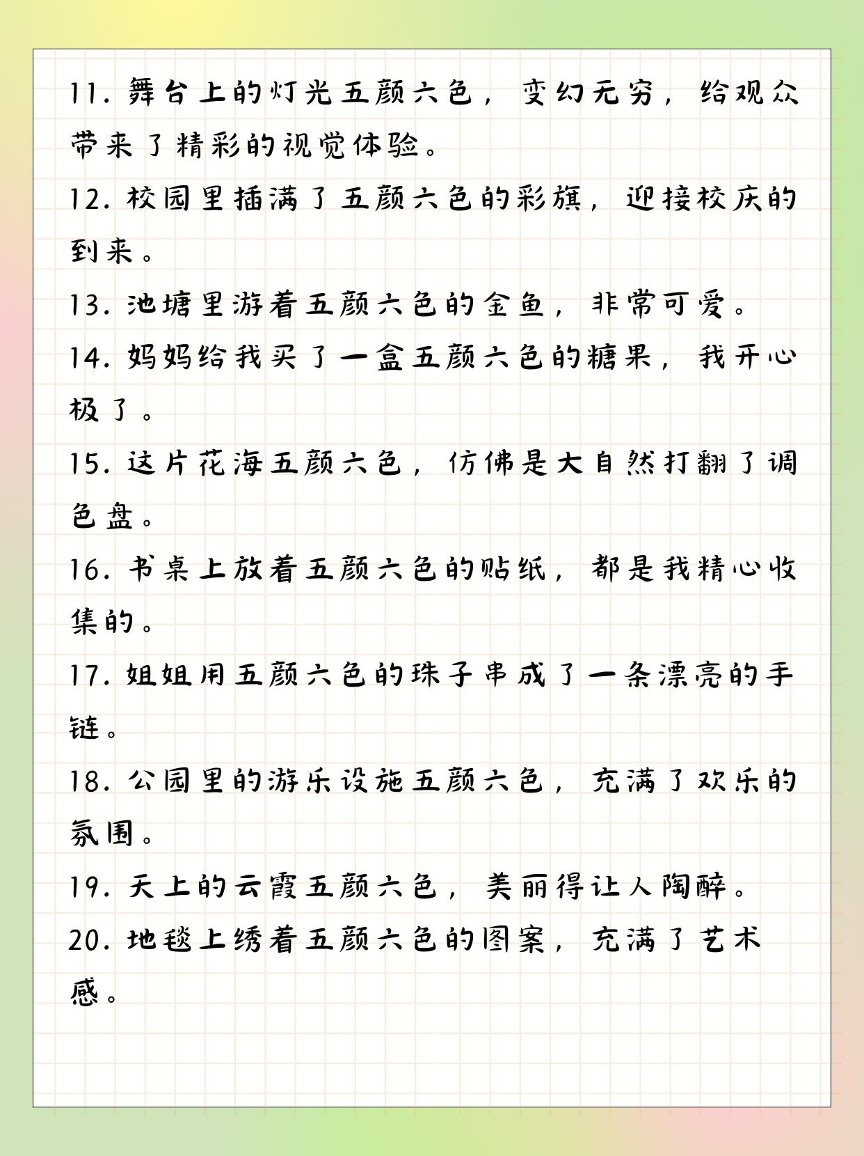 做最好的自己丰富的色彩汇聚出广科的活力和朝气明媚斑斓的春天色彩斑斓造句,一如年轻的我们好一个可爱的广科!微信编辑小科图片来源色彩斑斓造句;色彩斑斓 8理解词语并造句 憧憬对某种事物的期待与向往 造句我们对新校园充满憧憬,期待早点看到新校园的美丽风光。