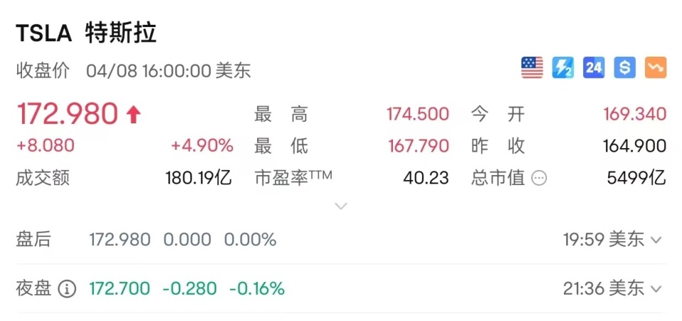 6、特斯拉股价周一飙升至近一年高点,主要受马斯克宣布公司正在进行前排无安全员值守的自动驾驶出租车测试这一消息提振尽管特斯。