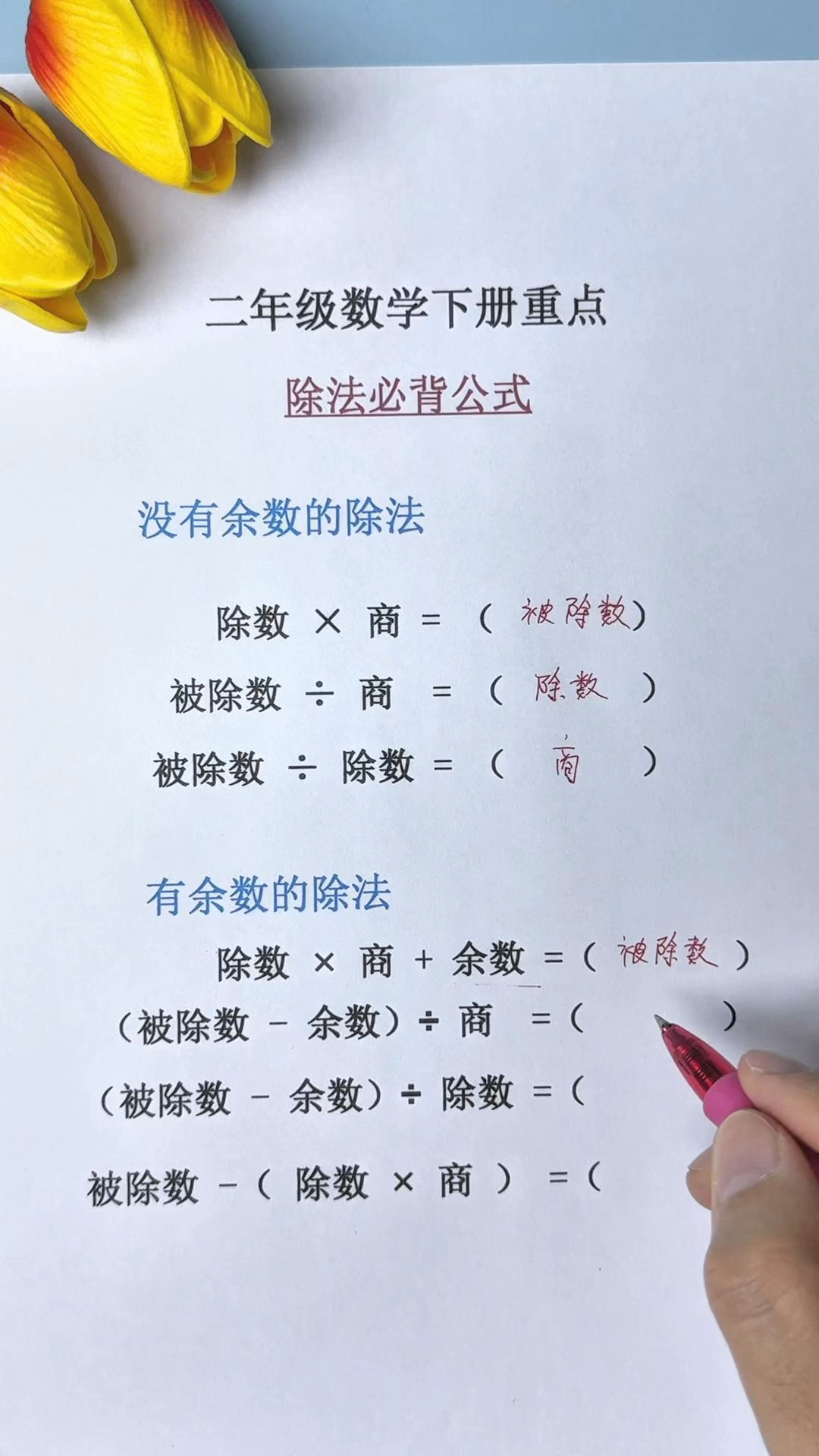 5、除法的运算定律公式包括以下几个方面1 被除数除以除数等于商,即 fracab = c ,其中 a 是被除数, b 是除数, c 是商2 被除数除以商等于除数,即 a div c = b 3 除数乘以商等于被除数,即 b imes c = a 4;3 除法分配律一个数除以两个数的和,等于这个数分别除以这两个数的商的和4 除法定律被除数和除数同时乘以或除以同一个非零数,商保持不变例如,若 a ÷ b = c,则 a × n ÷ b × n = c,其中 n 是任意非零整数5 除法余数定律在除法运算中,余数总是小于除数例如;除法的运算定律有除法交换律除法定律,相关知识如下1除法交换律交换两个除数的位置,商不变例如,如果a÷b=c,那么b÷a=c除法结合律先除后面的数再除前面的数,商不变例如,如果a÷b÷c=a÷b÷c除法分配律一个数除以两个数的和等于这个数分别除以这两个数所得的商的和2。