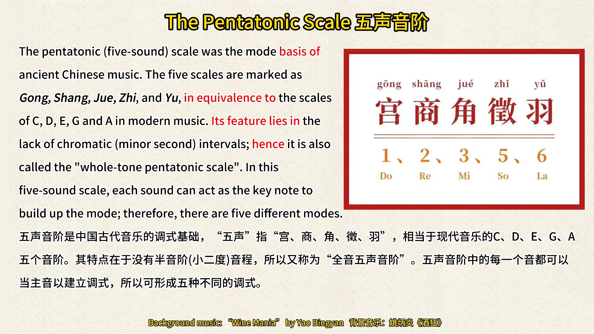 10、中国传统五声调式音阶由五个基本音构成,它们是宫商角徵羽这一音阶的特点在于其音与音之间的距离都是全音或半音,形成了一种独特的和谐感与之相比,西洋自然大调式音阶包含七个基本音,从主音到第七个音之间包含了全音半音全音全音半音全音全音的音程关系中国传统五声调式。