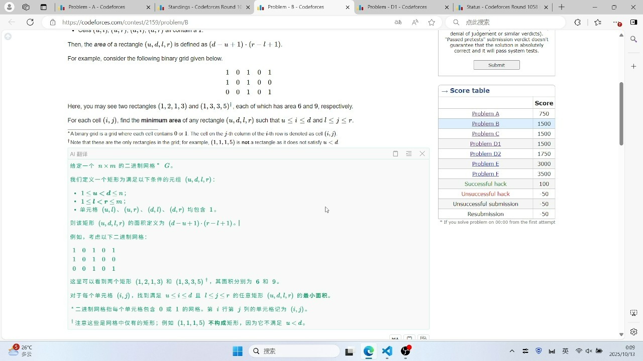 在网站右上角,找到你的用户名,并点击它旁边的设置选项选择界面语言在设置页面中,找到并点击“界面”选项在界面设置页面中,你会看到一个下拉菜单,显示当前的语言设置从这个下拉菜单中,选择“中文”保存设置点击“保存”按钮,Codeforces的界面将自动更新为中文注意事项 翻译准确性;Codeforces上分历程记录 初始阶段2023年9月9日用户计划通过刷题提升算法能力并冲击更高分段,当前处于青Pupil与绿Specialist之间徘徊,主要依赖Div3比赛上分,Div2比赛通常只能完成前三题,解题速度较慢当前刷题范围集中在15001900分题目,目标为尽快达到蓝名Expert初始目标;全球第二位Codeforces积分超过4000分的选手,是中国选手jiangly蒋凌宇2025年1月20日,算法竞技界的头部选手jiangly参加完当天的Codeforces在线算法竞赛后,个人积分突破了4000分,达到了4039分,成为Codeforces历史上第二位积分突破4000分的竞技者4039分也突破了tourist在2024年8月创造的4009分的记录,是;在 Codeforces 上注册账号,可按以下步骤操作准备工具确保有一台能正常上网的电脑进入主界面打开浏览器,在地址栏输入网址 codeforcescom,进入 Codeforces 主界面点击注册按钮在主界面右上角找到 “register” 按钮并点击填写注册信息点击 “register” 后,会出现注册信息填写界面,从上到;1 登录账号使用能上网的电脑打开Codeforces网站,进入主界面并登录个人账号2 搜索目标用户在页面右上角的搜索栏中输入想添加的好友用户名例如“tourist”,按回车键确认3 进入用户个人主页在搜索结果中点击目标用户的用户名,进入其个人主页4 点击五角星图标添加好友在用户主页的用户名旁,找;Codeforces 练习可视化与预测 rating 一Codeforces 练习可视化面板 对于主要在 Codeforces 平台上进行刷题的用户,特别是 rating 在 1400~3000 之间的非小号非 AI 用户,可以通过一个专门设计的可视化面板来跟踪和展示刷题进度及预测 rating 变化该面板能够直观地显示用户的刷题历史当前实力以及未来可能;Codeforces的Div3会进行查重Codeforces作为一个知名的在线编程竞赛平台,为了确保比赛的公平性和公正性,采取了一系列措施来防止作弊行为,其中就包括代码查重机制以下是关于Codeforces Div3查重机制的详细解释一查重机制的存在 Codeforces的Div3比赛,作为该平台举办的众多编程竞赛之一,同样遵循着严格的。