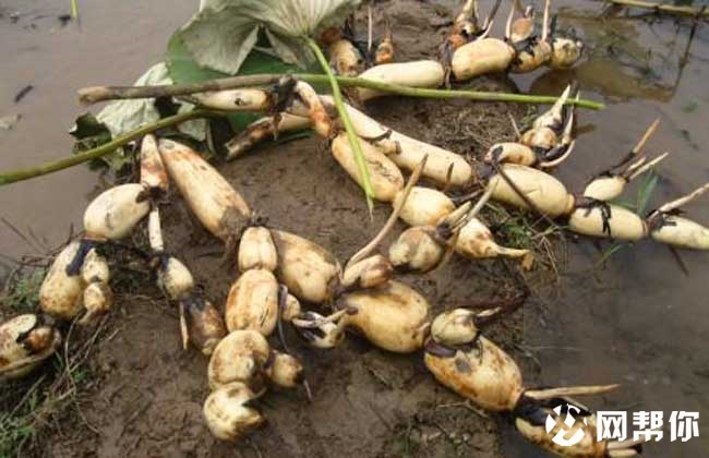 3、栽植时间:选择晴天下午先在田中将藕种按照所需的株行距排列好,再根据藕身的大小用手挖沟栽下,种藕的前端向下斜,后端稍露土面,有利于接受光照和空气,促进发芽。